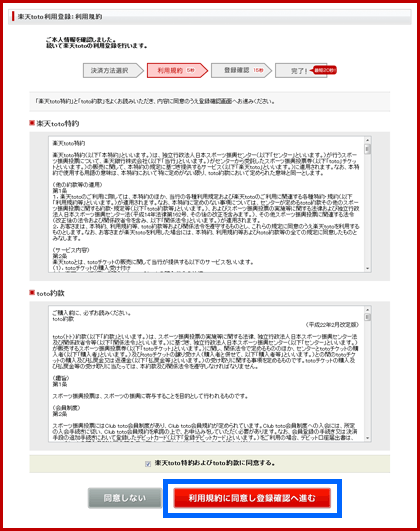 totoの購入に関する注意事項や規約の内容をよくご確認ください。同意いただける場合は「規約に同意し登録確認へ進む」ボタンで次に進んでください。