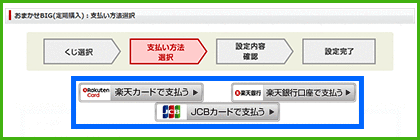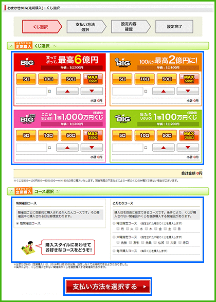 定期購入したいくじについて、希望する購入口数のボタンをクリックしてください。また、定期購入のパターンには、毎開催回コース、自分のスタイルに合わせ選ぶことができるコース選択があります。購入希望口数が決まったら「支払い方法を選択する」ボタンをクリックしてください。