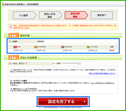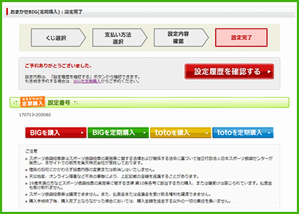これで定期購入の設定が完了しました。定期購入で予約されたくじの内容や当せん状況は【購入履歴・当せん結果】画面からご確認いただけます。