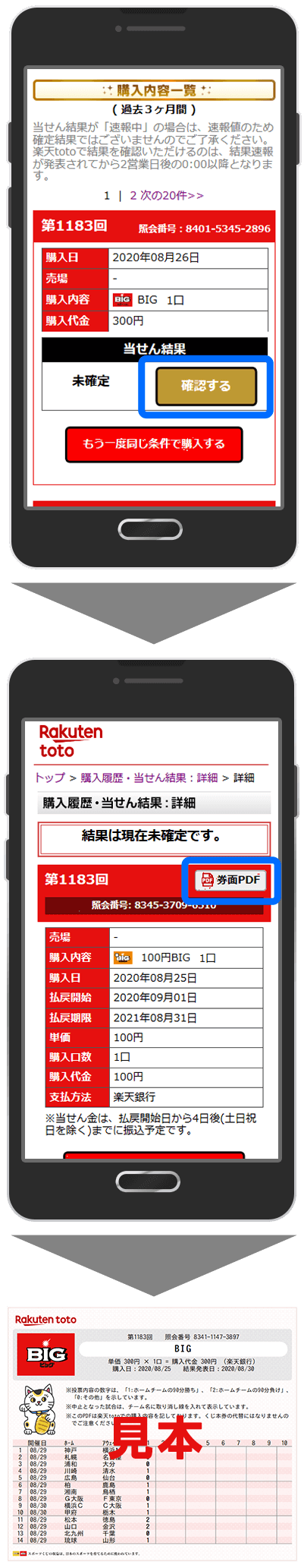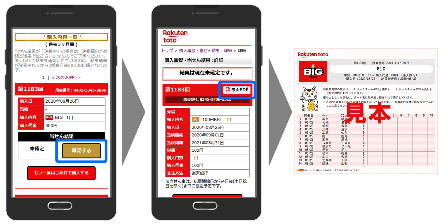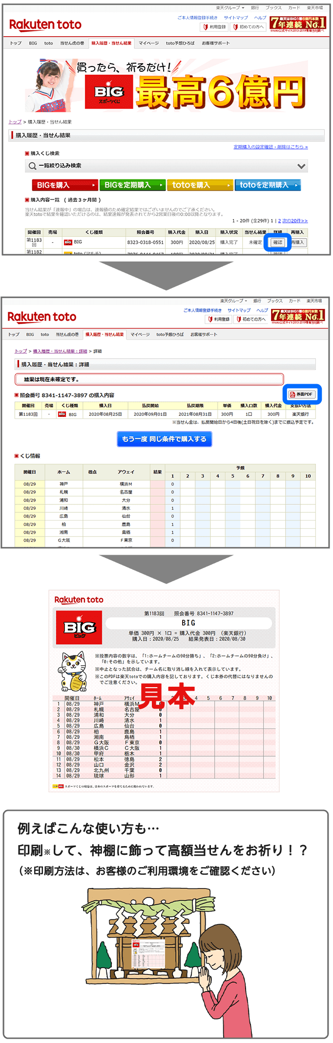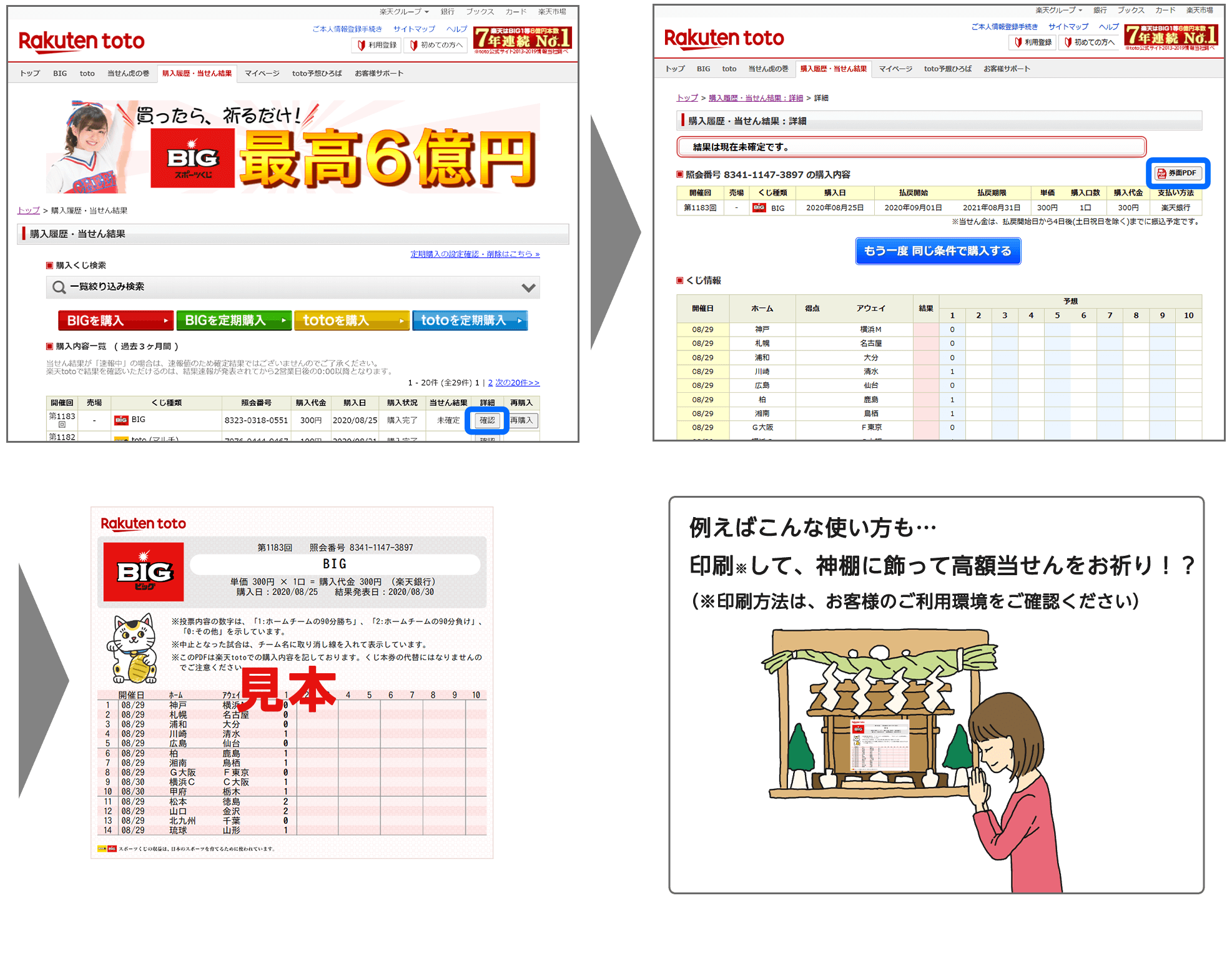 くじの購入後、購入履歴・当せん結果ページから購入内容をPDFでダウンロードできる機能です