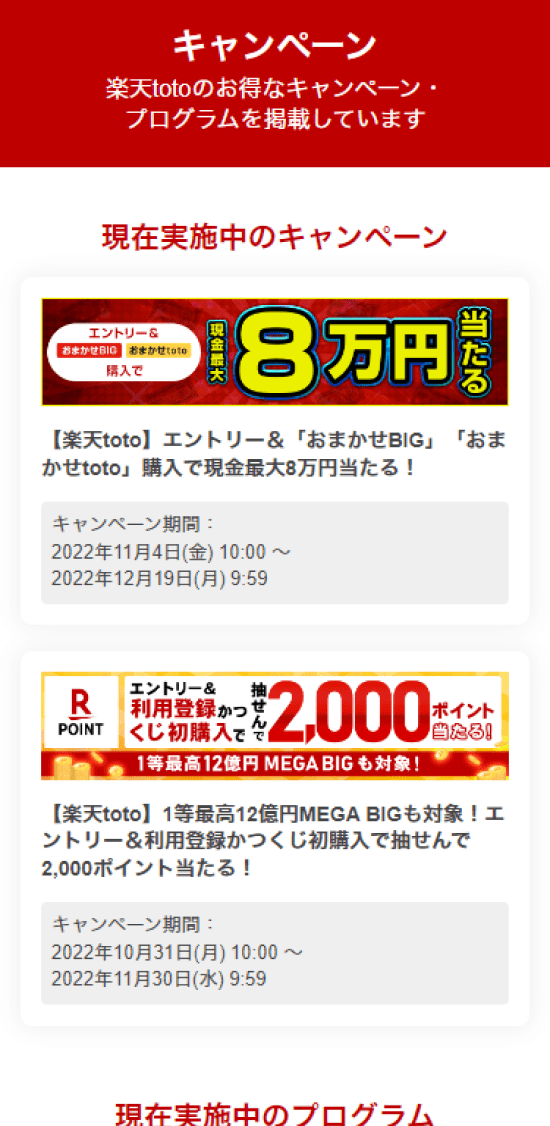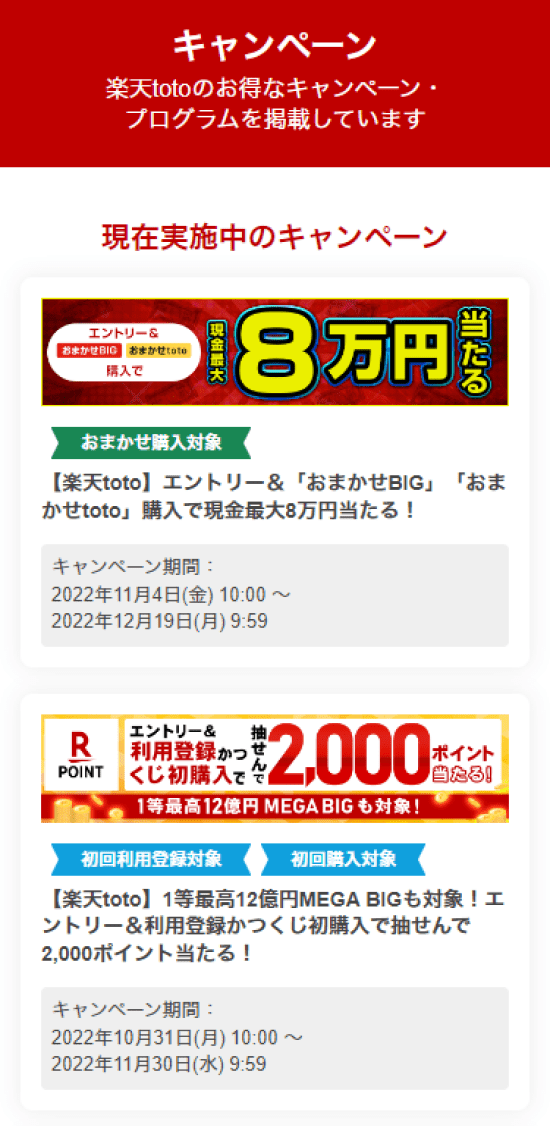 楽天totoでは、サービスご利用のお客様を対象として、様々なキャンペーンを実施しています。