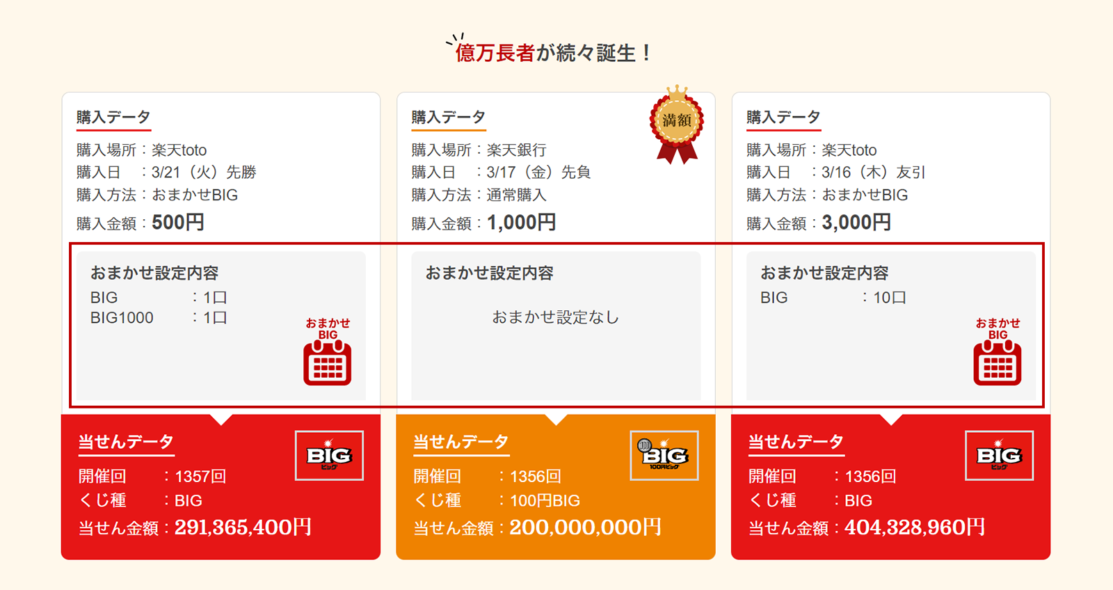 高額当せん情報ページ、楽天グループ当せん記録ページにて高額当せん時の「おまかせBIG設定内容」を掲載開始いたしました。