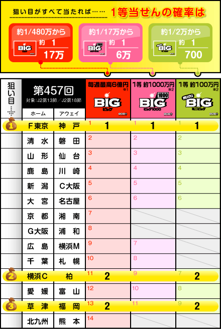 第457回BIGは、7月17日(土)が販売締め切りです。狙い目通りの数字が出るまで買い続ければ、6億円のチャンスがぐっと広がるかもしれませんもしこの3試合が的中すれば、mini BIGは1等当せん確率が1/700です。6億円のBIGと併せて、このチャンスをお見逃しなく。