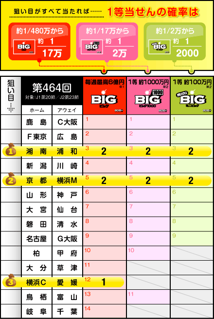 8月21日(土)が販売締め切りの第464回BIGは、約55億6000万円のキャリーオーバーが発生中。狙い目通りの数字が出るまで買い続ければ、6億円のチャンスがグッと広がるかもしれません。もしこの3試合が的中すれば、BIGの1等当せん確率は、約1/480万から約1/17万にアップします。みなさん、通算103人目の6億長者を目指しましょう。
