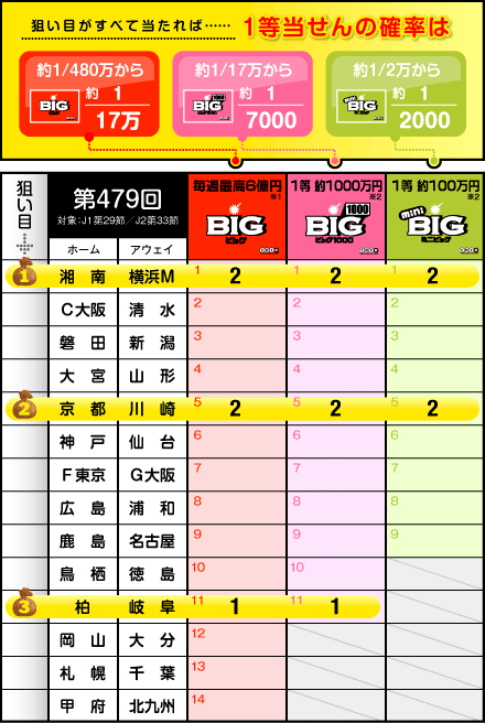 2010シーズンのBIGは残り5開催。約60億4000万円のキャリーオーバーが発生している第479回BIGは、くじを買ったあとに下記の予想表と照らし合わせて見てください。できるだけ確率を高めて、数少ないチャンスをものにしていきましょう。