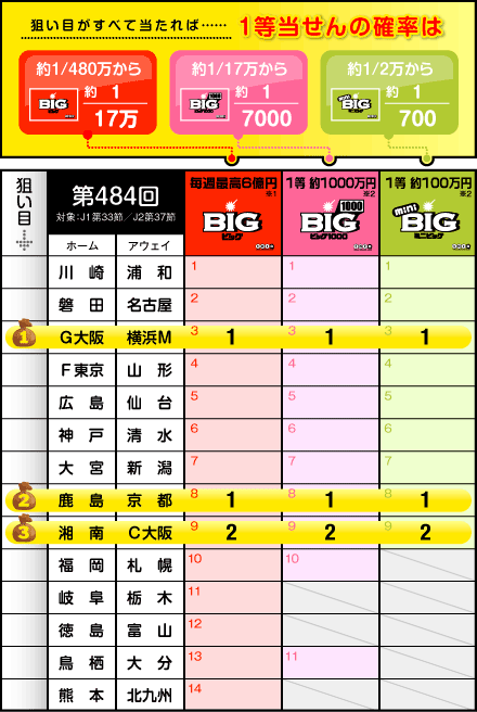 BIG愛好者の皆さんもtoto愛好者の方に負けないモチベーションで6億長者を目指しましょう何と言っても、キャリーオーバーの額で言えば、BIGも負けていませんからね現在のキャリーオーバー額は、何と驚きの約62億7,000万円 今シーズンのBIGも残り2開催を残すのみとなっていますので、このチャンスで夢の6億円をゲットしちゃいましょう それでは、第484回の予想に行ってみたいと思います。