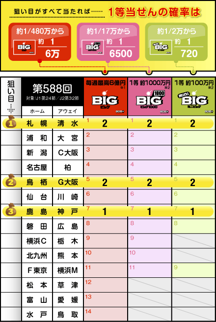 第587回はBIGで3開催ぶり、totoも2開催ぶりに1等当せんが生まれない結果となりました。前回はBIG、totoともに最高当せん金である6億円と2億円がそれぞれ誕生していただけに、少し寂しく感じてしまいますね。しかし、キャリーオーバーはBIGが約55億円、totoも約6800万円と、ともに高額に積み上がっていますので、次回の第588回では大型当せんの期待が持てるのではないでしょうか。