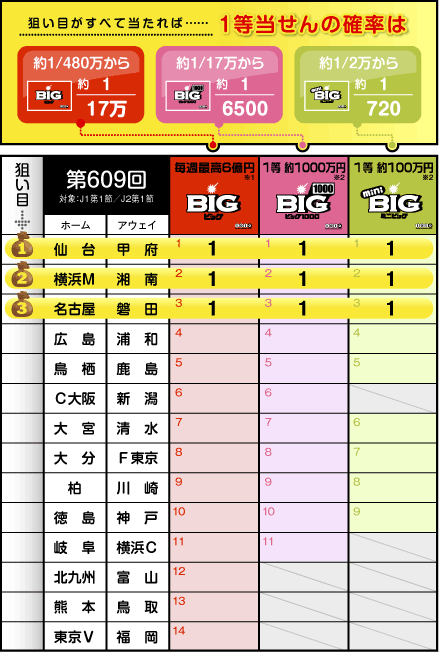 トップページ > totoBIG当せん虎の巻 > totoONEコラム > totoONEコラム一覧(2013年) > 02月22日 今季からBIG6等が導入され、さらに当せんの可能性がアップ...