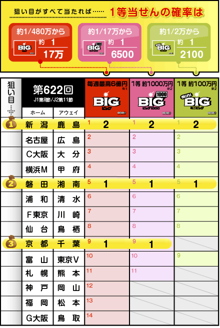 首位横浜Mの勢いを止めた新潟の堅守はプレスは折り紙つき。横浜Mの樋口靖洋監督が「ここまで対戦した中で、一番厳しく来ていた」と語ったほど。しかし鹿島も甲府戦で得た教訓を生かし、固い守備網をかいくぐるゴールの奪い方を考えて試合に臨むだろう。今節は鹿島の勝負強さと攻撃陣のコンディションの良さを基に、鹿島勝利の「2」で勝負するのも一つの手だろう。