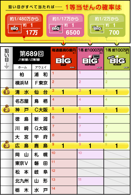 記述のとおり、近年の相性やチーム状態でリードするのは広島。リーグ王者の勝利を見込む「1」は確実に押さえておきたい。