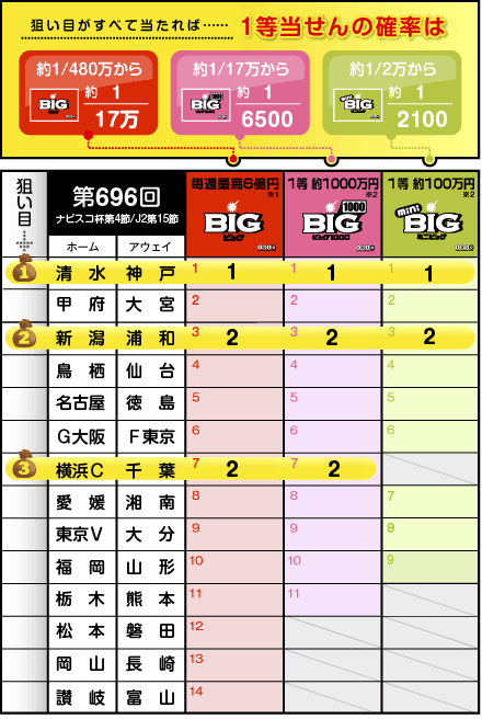 第694回BIGでは、4開催ぶりに1等が誕生しない結果となりました。ワールドカップのために、J1が約2カ月間の中断期間に入りましたが、BIGに影響はありません。次回の第696回は、ヤマザキナビスコカップとJ2を対象に実施。今後はワールドカップの結果も対象となるため、BIGは中断期間もなく開催が続きます。チャンスは広がっていますので、どんどんチャレンジしていきましょう。