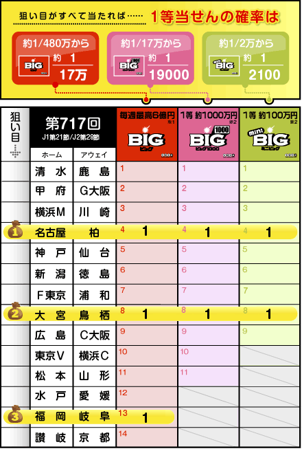 名古屋は今季、調子が今ひとつながらも、リーグ戦第3節、ナビスコ杯第6節で柏に勝利。相性面で優位に立つだけに、ホームチーム勝利の「1」は押さえておきたいところだ。