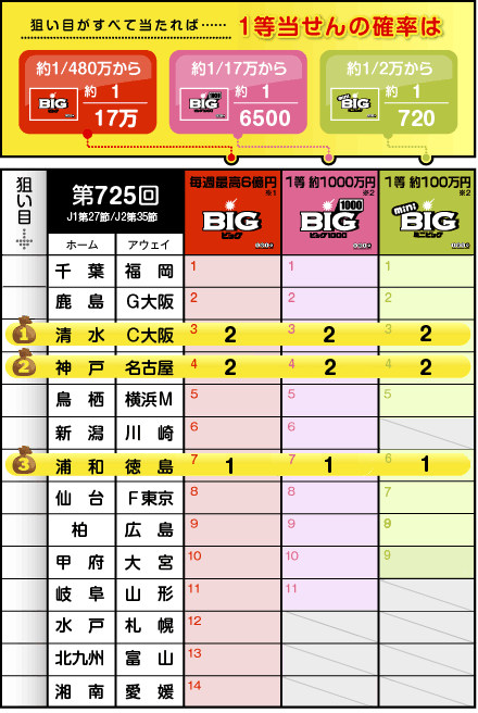 記述のとおり、C大阪はここ数試合のチーム状況に加え、相性面でも清水をリード。アウェイチーム勝利の「2」が狙い目と言えそうだ。