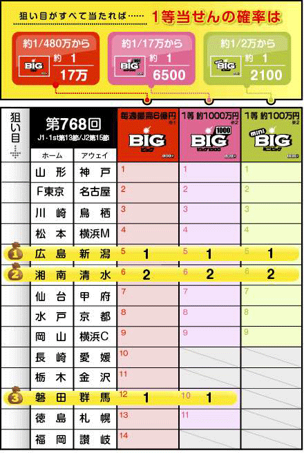 20日時点での投票率では、湘南が約43%、清水が約32%と、ホームチーム優位との見方が強いが、データ上で分があるのは清水。ここはアウェイチーム勝利の「2」を押さえることをオススメしたい。