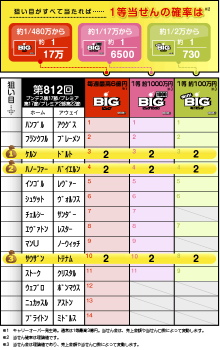 totoBIGでも、1等の当せんが複数本、出ることがあります。前回の第810回では1等6億円当せんが2口生まれました。第812回に向けても約2億6000万円のキャリーオーバーが発生していますので、みなさんもクリスマス前のBIGなチャンスにチャレンジしてみてはいかがでしょうか。