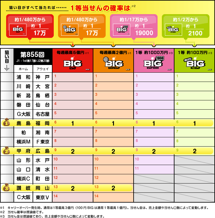 通常のBIGは最高6億円の当せんとなりますが、第855回のBIGではいつもより1等の当せん金額が4億円も多いボーナス版(これまでは『10億円BIG』という名称でした)。といっても購入方法が変わるわけではなく、これまでどおりBIGを購入していただくだけでオッケー。1等の当せん金額だけが最高10億円になるという、まさに夏のBIGボーナスです。