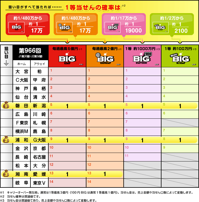 BIGは「1」(ホームチーム勝利)、「2」(アウェイチーム勝利)、「0」(引き分け)の3つの数字がそれぞれの試合に割り当てられるシンプルなシステムなので、上記のような混乱が生じることはまずないと言えるでしょう。第965回のBIGでは1等6億円の当せんが1口、誕生しました。第966回に向けては約38億6000万円のキャリーオーバーが発生しており、引き続き高額当せんのチャンスがあります。シンプルに楽しめるBIGに、ぜひともチャレンジしてみてください。